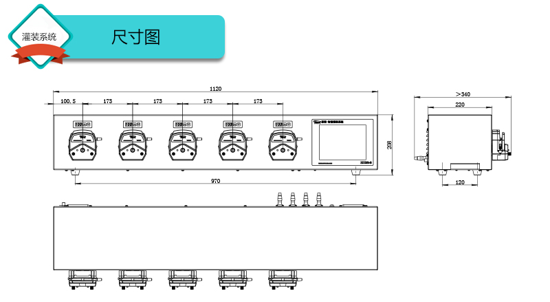 1.灌裝系統(tǒng)由5組基本通道(可擴展至32通道),一臺控制器組成,可安裝YZ15、YZ25泵頭